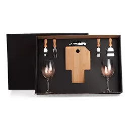 DESCRIÇÃO: Kit para queijo e vinho. Conta com tábua para queijo/petisco; duas facas, sendo, uma com ponta e outra reta, garfo e espátula em bambu/inox; duas taças para vinho em vidro e abridor em metal. Estão perfeitamente acomodados em uma caixa para presentear.
