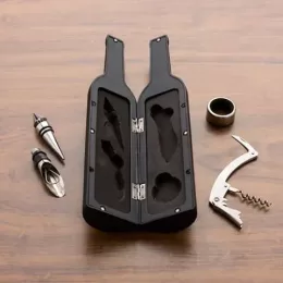 Conjunto para vinho estojo emborrachado em formato de garrafa contendo 4 peças, 1 bico dosador, 1 tampa de metal para garrafas de vinho, 1 anel para gargalo, 1 saca rolhas com lâmina.