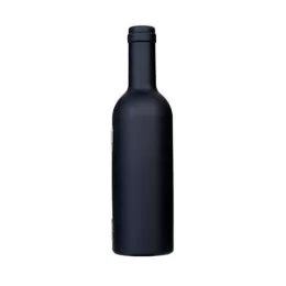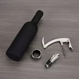 Kit vinho formato garrafa com 3 peças, material plástico resistente e revestido internamente com espuma. Possui wine collar, bico condutor com tampa e saca rolhas.