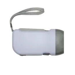 Lanterna plástica com 3 leds, pressionando o “gatilho” gera energia para alimentar a lanterna dínamo. Possui botão para ligar/desligar lanterna, botão para travar gatilho e acompanha cordão.