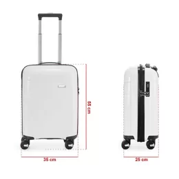Descrição: Mala de bordo 40 litros em plástico (casca dura), contém cadeado numérico TSA. Compartimentos com bolso telado e cinta compressora para roupas. A mala possui duas alças de mão, puxador retrátil com regulagem de tamanho, quatro rodinhas 360º e apoios laterais. Acompanha placa para personalização.