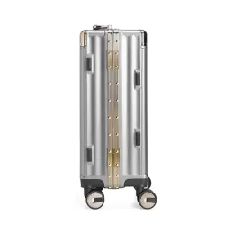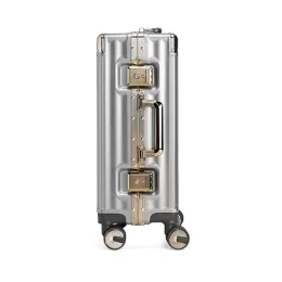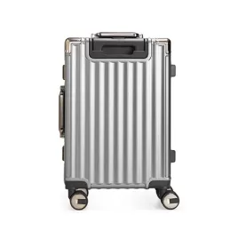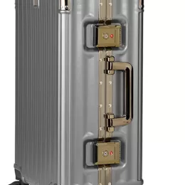 Descrição: Mala de viagem 38 litros feita em plástico com acabamento em alumínio, contém cadeado numérico TSA. Compartimentos internos com bolso telado, bolso plástico para itens molhados e cinta compressora para roupas. A mala possui duas alças de mãos, puxador retrátil com regulagem de tamanho, suporte porta bolsa, quatro rodinhas 360º e apoios laterais.
