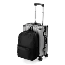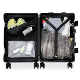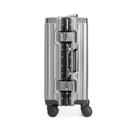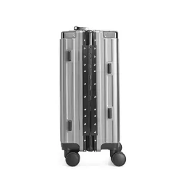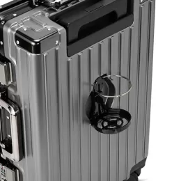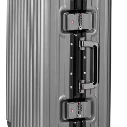 Descrição: Mala de viagem 46 litros feita em plástico com acabamento em alumínio, contém cadeado numérico TSA. Compartimentos internos com bolso telado, bolso plástico para itens molhados e cinta compressora para roupas. A mala possui duas alças de mãos, puxador retrátil com regulagem de tamanho e suporte para celular, suporte porta bolsa, suporte para copo ou garrafa, quatro rodinhas 360º e apoios laterais.