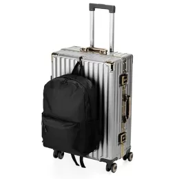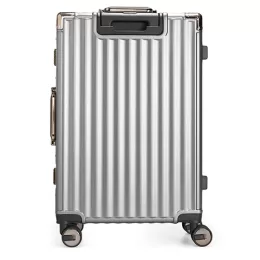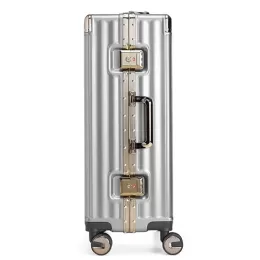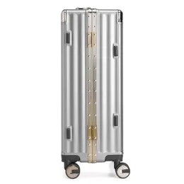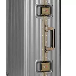 Descrição: Mala de viagem 68 litros feita em plástico com acabamento em alumínio, contém cadeado numérico TSA. Compartimentos internos com bolso telado, bolso plástico para itens molhados e cinta compressora para roupas. A mala possui duas alças de mãos, puxador retrátil com regulagem de tamanho, suporte porta bolsa, quatro rodinhas 360º e apoios laterais.