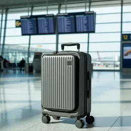 Mala de viagem feita em ABS com capacidade de até 33 litros quando o zíper externo de expansão é aberto. Possui abertura frontal com bolsos de zíperes, uma divisória para notebooks de até 15,6 polegadas e cinta compressora para roupas. Conta ainda com cadeado TSA embutido na parte superior, quatro rodinhas giratórias 360°, duas alças de mão, além de apoios e ganchos laterais. Acompanha placa metálica personalizável.
