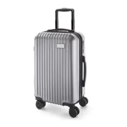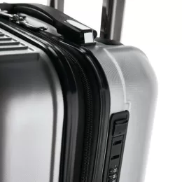Mala de Viagem Executivo. ABS e PET. Interior forrado, com divisória. 4 rodas duplas giratórias. Pega extensível em alumínio, com mola (altura pega estendida: 525 mm). Fecho de segurança com senha. Chapa metálica removível para fácil gravação. 320 x 480 x 225 mm | Chapa: 60 x 30 mm