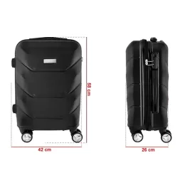 Descrição: Mala de viagem média confeccionada em ABS com trava de segurança. Possui quatro rodinhas e apoiadores com borracha anti-deslizante para posicionar a mala na horizontal, alça de carrinho com botão para ajuste de tamanho; placa central para personalização; forro de poliester e compartimentos internos de zíper além de um cinto protetor.