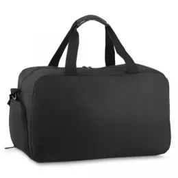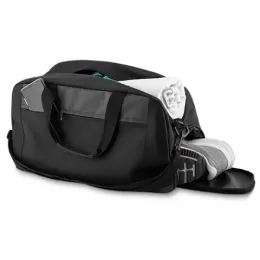 Mala esportiva em polyester, compartimento interno isolado para materiais molhados com abertura lateral, alça de ombro, alça de mão dupla, bolso externo com ziper.