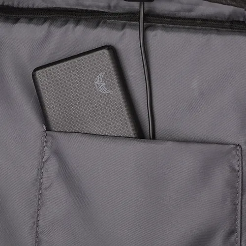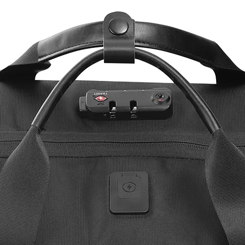 Mala executiva em poliéster 600D com interior em 210D, compartimento interno com zíper, alça de ombro e mão, entrada usb, cadeado com senha/segredo, cadeado tipo TSA e compartimento para notebook de até 15,6″.