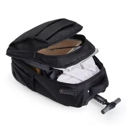 Descrição: Mochila 27 litros com rodinhas e cadeado TSA. Possui padrão para bagagem de mão, conforme especificações ANAC (Agência Nacional de Aviação Civil) Confeccionada em nylon, contém alça revestida com espuma para um maior conforto, puxador retrátil com regulagem e botão acionador, alças para as costas escondidas no compartimento traseiro com zíper. Com 5 compartimentos, sendo um pequeno para carteira e canetas, dois medianos para documentos, bolsos nas laterais, bolso para notebook até 15,6 polegadas com divisórias para celular e forro com zíper. Possui duas rodinhas e freio em plástico, além de um sistema velcro para junção do compartimento das alças com a parte inferior, tampando as rodinhas enquanto transporta a mochila nas costas.