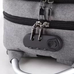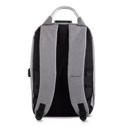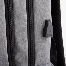 Descrição: Mochila anti-furto com cadeado de segredo. Material de poliéster cinza, tem a parte frontal à prova d’água (respingos). Compartimento principal com bolso para notebook e bolso de tela, parte externa com cadeado de segredo para trava dos zíperes; bolso médio com pequenas divisórias e bolso frontal com fita reflexiva. Possui entrada para fone de ouvido, suporte com entrada USB na parte externa e cabo USB acoplado internamente; permitindo a conexão de um carregador portátil na área interna e a conexão de um eletrônico na área externa, viabilizando a carga e utilização do eletrônico enquanto caminha. Alças para as costas ajustáveis revestidas com espuma para um maior conforto, alça para mãos em metal e alça horizontal para encaixe em malas de viagem. Utilização do cadeado: para criar um segredo pressione e segure o botão, crie a numeração desejada e em seguida solte o botão para assumir a codificação criada, repita o mesmo processo sempre que necessitar fazer alguma alteração.
