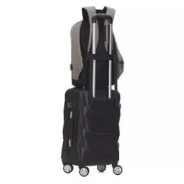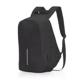 Descrição: Mochila anti-furto de poliéster. Pensando na segurança do usuário foi confeccionado o compartimento principal na área traseira, impossibilitando a abertura do produto mesmo com a mochila na costa do usuário. Possui dispositivo com entrada USB na parte externa com cabo USB acoplado internamente; permitindo a conexão de um carregador portátil na área interna e a conexão de um eletrônico na área externa, viabilizando a carga e utilização do eletrônico enquanto caminha. Área interna do compartimento principal: bolso para notebook de 15,6 polegadas, bolso para tablet, quatro bolsos para acessórios, possui nas laterais internas sistema de velcro, maximizando a segurança da mochila. Parte frontal com faixa refletiva, alças para costa ajustáveis sendo uma delas com bolso de zíper, alça para mãos, alça horizontal para encaixe em malas de viagem, alças de costa e parte traseira revestidas com espuma para um maior conforto.