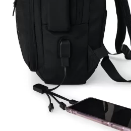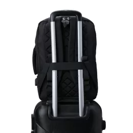 Mochila confeccionada em Nylon 20 Litros com 4 compartimentos, sendo o principal com bolso para notebook 15,6. Possui um bolso externo, bolsos e divisórias internas para acessórios, a mochila possui suporte externo USB, alça com bolso integrado para cartões, alça para engate em malas de viagem e duas alças de mãos, sendo um delas para o transporte da mochila no formato pasta.