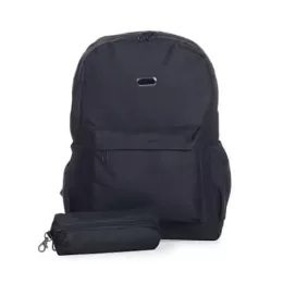 Descrição: Mochila de nylon com estojo. Possui compartimento grande com bolso interno para notebook de revestimento poliester, bolso frontal acompanha um estojo com mosquetão. Possui bolsos laterais, zíperes preto, alça superior de nylon, alças para costa ajustáveis e plaquinha para personalização na área frontal.