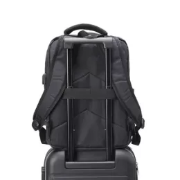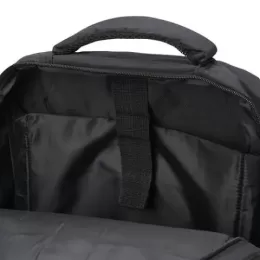 Descrição: Mochila de nylon 20 litros com três compartimentos, sendo o principal com bolso para notebook 15,6. Com bolsos laterais e faixa frontal refletiva, a mochila possui adaptador USB externo, alça para encaixe em malas de viagem, duas alças de mãos e alças para as costas com revestimento espumado. Acompanha plaquinha metálica.