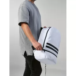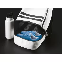 Mochila em 290T poliéster reciclado (100% rPET), em sarja com forro em 210D poliéster reciclado (100% rPET). Contém 1 compartimento principal e 1 compartimento inferior ideal para guardar sapatos. Mochila totalmente forrada com costas e alças almofadadas. Contém duas faixas pretas refletoras na parte da frente. Capacidade até 25 L. 300 x 480 x 210 mm
