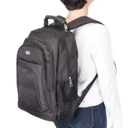 Descrição: Mochila nylon poliester para notebook. Possui compartimento grande com bolso interno para notebook, dois compartimentos médios, bolso pequeno frontal e bolsos laterais de rede. Zíperes prata, alça superior com pegador emborrachado e tira de silicone com cabo de aço interno para garantir maior resistência, alça superior de nylon, alças para costa ajustáveis revestidas com espuma, parte traseira também revestida de espuma para maior conforto. Possui placa metálica espelhada na parte frontal.