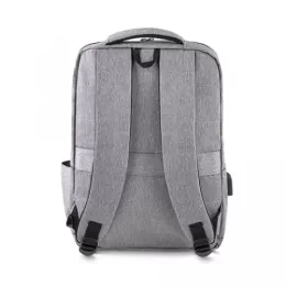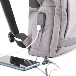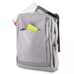 Mochila p/ Notebook, tecido poliéster, bolso central com porta notebook, mais três bolsos interno porta tablet, celular e carteira, bolso frontal abertura superior lateral, um mini bolso externo na lateral, alça de ombro e mão, toda forrada, cabo USB e áudio interno com conector externo na lateral.