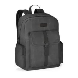Algodão canvas pré-lavado. Compartimento forrado, com 2 divisórias almofadadas para notebook até 15.6” e tablet 10.5”. Bolso frontal e 2 bolsos laterais. Parte posterior e alças almofadadas. Com alça para transporte em trolley e placa em c. sintético para personalização. 300 x 420 x 120 mm | Placa: 60 x 30 mm