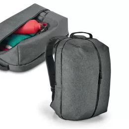 600D de alta densidade. Com 2 compartimentos. Compartimento posterior forrado, com diversos bolsos interiores e 2 divisórias almofadadas para notebook até 15.6” e tablet 10.5”. Compartimento frontal forrado, ideal para transporte de roupa (ou para lazer). Parte posterior e alças almofadadas. Alça para transporte em trolley. 300 x 450 x 160 mm