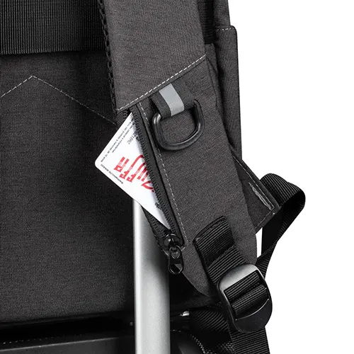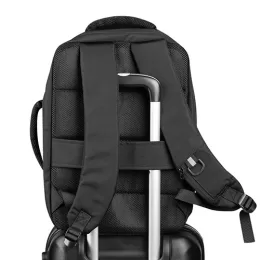 Mochila produzida em tecido de poliéster 600D e PU, com engate para mala de viagem, alça de ombro acolchoada, bolsos frontais com zíper,dois compartimentos laterais, aceita notebooks de até 15,6”. Alça de ombro ajustável, porta USB na lateral da mochila, compartimento com zíper na alça de ombro para pequenos objetos.