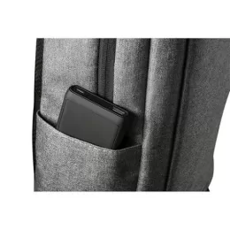 Mochila para notebook em 300D com placa de personalização. Tem 1 compartimento principal com 2 bolsos forrados para notebook até 15,6″ e tablet 10,5″ e diversos bolsos interiores. Inclui banda para transporte em trolley, bolso frontal, bolso lateral e entradas USB e Jack 3,5 mm. Parte posterior e alças são almofadadas. 320 x 410 x 120 mm