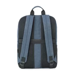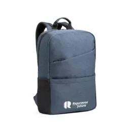 Mochila para notebook em rPET 600D com alças almofadadas. O compartimento principal tem 2 divisórias almofadadas para notebook até 15.6” e tablet até 10.5”. Contém dois bolsos com fecho na parte frontal e um bolso lateral em rede com elástico. Parte posterior almofadada com banda para transporte em trolley. 300 x 420 x 110 mm