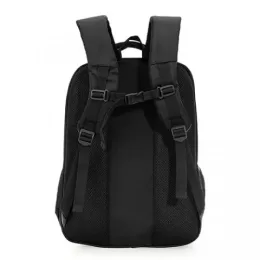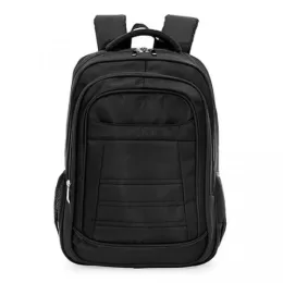 Descrição: Mochila confeccionada em poliéster de alta qualidade com compartimento principal com bolso para notebook 15.6 polegadas, compartimento mediano com bolso para documentos e canetas, compartimento frontal com bolso de velcro e bolsos laterais em malha. Contém zíperes prata, alças para costas ajustáveis com regulagem peitoral e parte traseira com revestimento anti-transpirante, possui duas alças de mãos em nylon, sendo uma delas com revestimento interno.