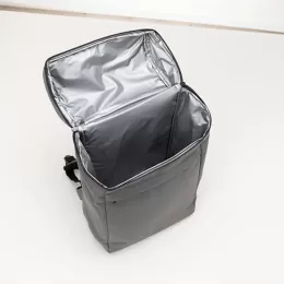 Descrição: Mochila térmica 17L confeccionada em poliéster, possui bolso frontal com zíper, alça para as mãos em nylon, e alça para as costas ajustáveis com revestimento antitranspirante