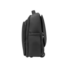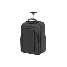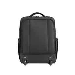 Mochila trolley em 900D com revestimento resistente à água. Compartimento principal espaçoso com bolso para portátil até 17,3″, 3 bolsos frontais com zíper e 2 bolsos laterais com elástico no topo para transportar a sua squeeze. Mochila trolley com protetor de rodas e pega extensível em metal. Parte posterior e alças almofadadas. Placa metálica removível com imã, para fácil gravação. Capacidade até 28 L e peso de 1,80 kg. 330 x 480 x 185 mm