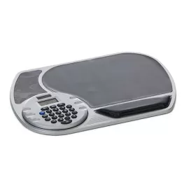 Mouse pad com calculadora plástica. Material plástico prata, mouse pad preto emborrachado com apoio para mão revestido com espuma, calculadora solar de 8 dígitos circular com detalhes em relevo na lateral(acompanha uma bateria L1131) e área plástica em preto para personalização.
