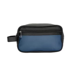 Nécessaire em couro sintético impermeável com fechamento em zíper. Possui bolso frontal também com zíper e alça lateral de mão.