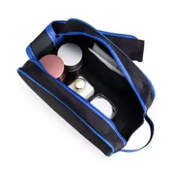 Descrição: Necessaire de poliéster com alça lateral e dois zíperes com cordão interligado. Possui um bolso interno.