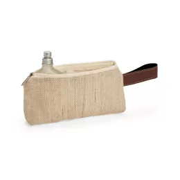 Descrição: Nécessaire compacto feito em juta, alça de mão lateral em bidim e fechamento em zíper.