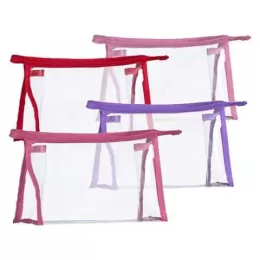 Descrição: Necessaire plástica transparente com detalhe colorido em nylon.