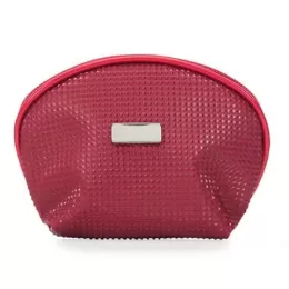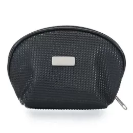 Necessaire em couro sintético texturizado com uma placa central para personalização. Parte interna revestida com cetim.