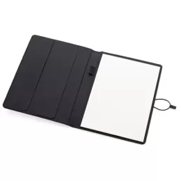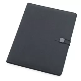 Descrição: Pasta convenção com capa almofadada em tecido de poliéster. Contém 20 folhas para anotação, porta canetas, porta documentos e porta cartão internos. Possui elástico lateral com detalhe em couro sintético para fechamento da pasta.