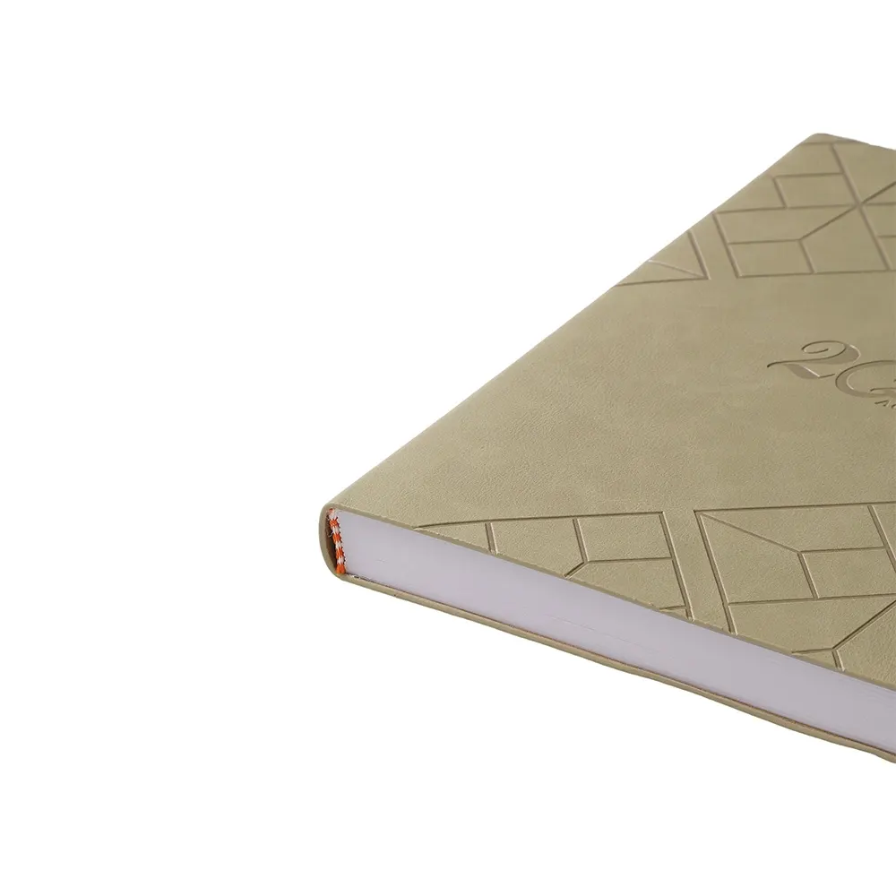 Descrição: Planner com capa dura em cromato, marca-páginas em fita de cetim e elástico para fechamento. Apresenta páginas dedicadas a dados pessoais, calendários de 2025 a 2027 e espaços para anotações diárias e semanais durante todo o ano.