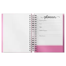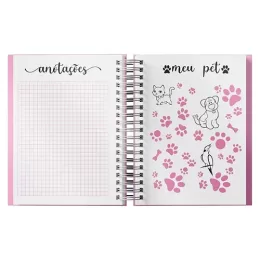 Planner anual em percalux com calendários mensais e semanais. Não possui datas fixas. Além dos calendários o planner contém páginas de identificação, roda da vida, datas importantes, senhas e acessos, contatos, metas anuais, planejamento anual, livros para ler, filmes para ver, minhas séries, controle financeiro, metas financeiras, despesas previstas, contas parceladas, saúde financeira, cuidados com a saúde, meu ano em pixel, e uma parte especial pets para registrar as informações, cuidados, compromissos, cronograma alimentar, vermífugos e vacinas.
