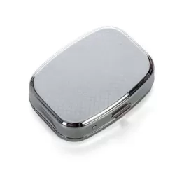 Descrição: Porta comprimido de metal, parte superior(tampa) brilhante externo e interno e lado inferior com detalhes estilo mosaico. Parte interna com duas divisórias plásticas.