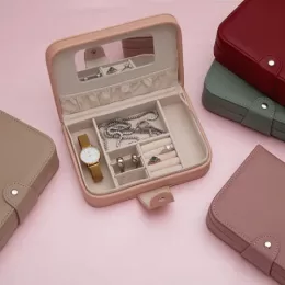 Descrição: Porta joias em couro sintético com revestimento aveludado e espelho. Possui compartimentos internos para anéis, pulseiras, colares e placas para brincos.