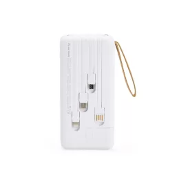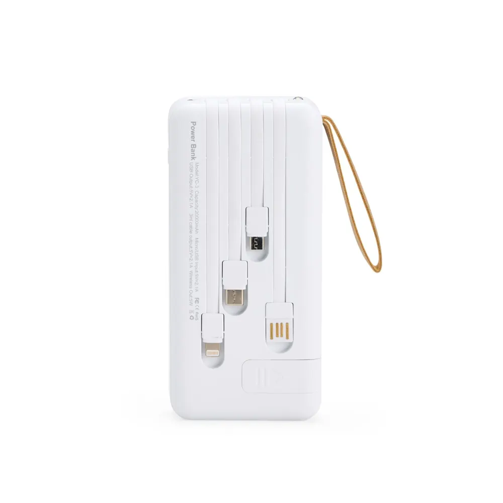 Descrição: Power Bank em plástico com capacidade de 10.000mAh. Possui quatro cabos integrados com saídas para Lightning, USB-C, Micro-USB e USB, além de área de recarga por indução magnética para dispositivos compatíveis e lanterna de LED. Conta ainda com entradas USB-A e USB-C para recarga do próprio aparelho e alça de tecido sintético para transporte.