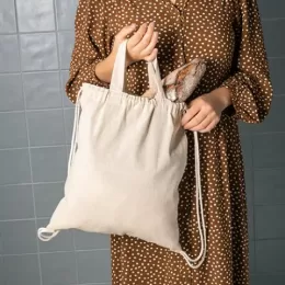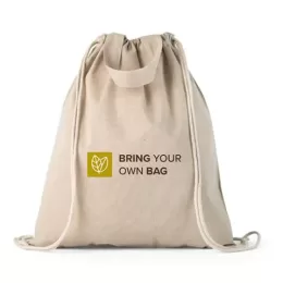 Sacola tipo mochila com algodão reciclado (140 g/m²), alças de 30 cm e cordões em algodão para fechar. 370 x 410 mm