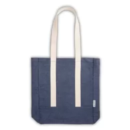 Sacola casual em denim reciclado (270 g/m²). Contém 1 bolso interior com fecho, costuras reforçadas e alças em webbing de algodão de 64 cm. 340 x 390 x 100 mm