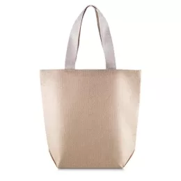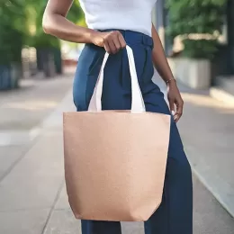 Sacola em Juta 360g/m² com alça em algodão cru e base plana ,interior revestido em plástico PP. Alça com altura de 24 cm, ideal para transporte.