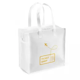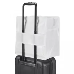 Sacola. Non-woven laminado: 140 g/m². Fecho zíper. Fundo reforçado. Alça para encaixe em trolley. Alça em webbing de 65 cm. 350 x 350 x 200 mm