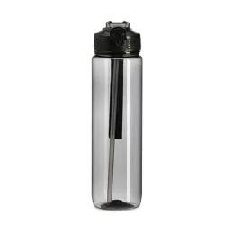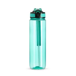 Squeeze plástico com capacidade de 1 litro, livre de BPA. Possui tampa rosqueável com bico de canudo, tampa protetora, botão de acionamento e trava de segurança. Acompanha cordão de nylon e canudo.