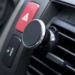 Suporte veicular magnético plástico resistente com detalhe colorido. Para utilizar basta pressionar o “botão” para ajustar o “pregador” na saída de ar do veículo(é possível rotacionar a base). Possui seis imãs embutidos de alta fixação, acompanha “ficha” circular magnética para ser colocada na capa do celular e magnetizar ao imã(não danifica o celular).